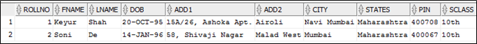 (ROLLNO, FNAME, LNAME, DOB, ADD1, ADD2,