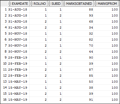 (EXAMDATE, ROLLNO, SUBID, MARKSOBTAINED,